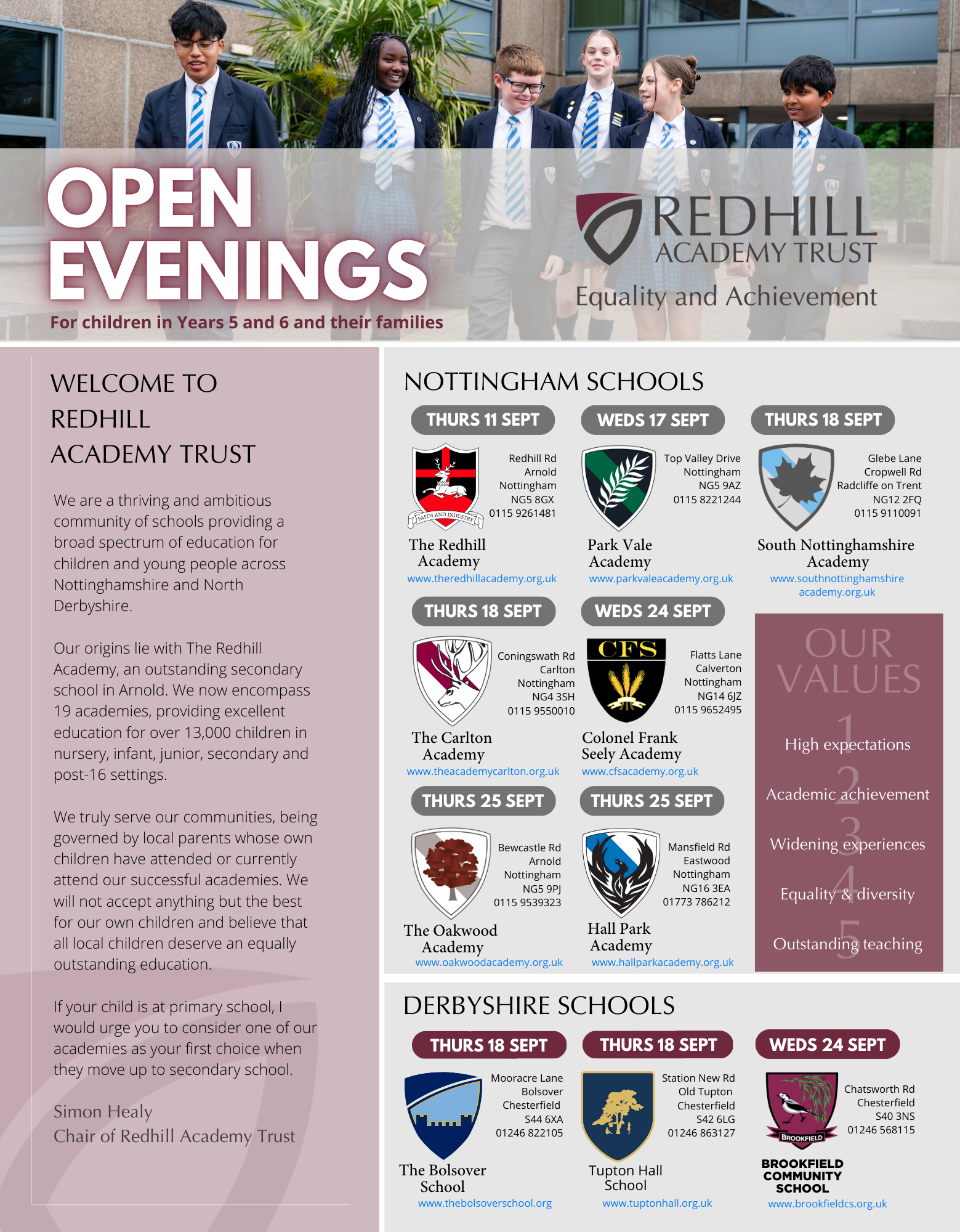 Our academies open their doors every Autumn to welcome local families and showcase what they can offer. Details of upcoming events can be found below.